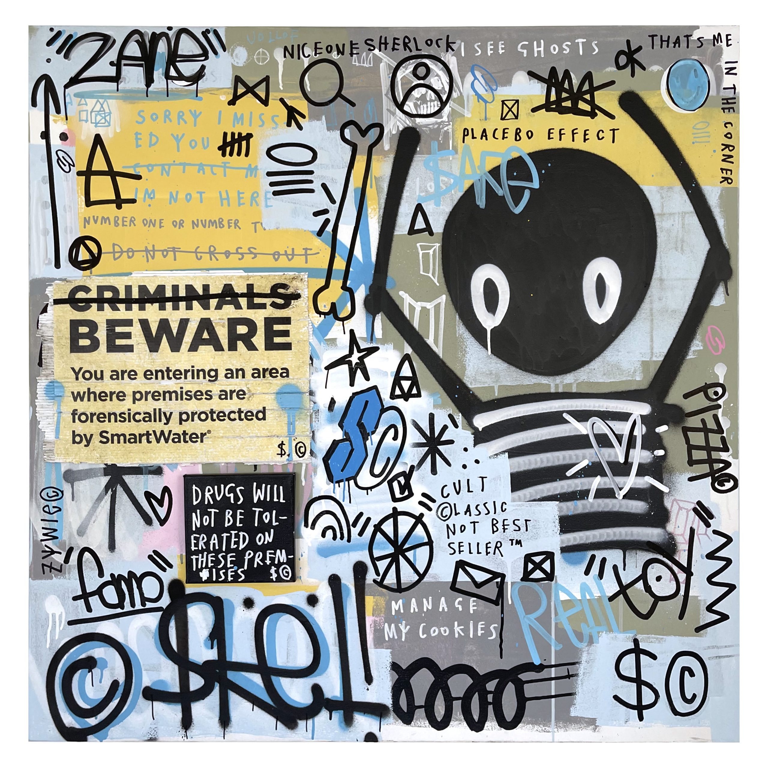 Found Sticker, Acrylic, Paint Marker, Spraypaint on Canvas