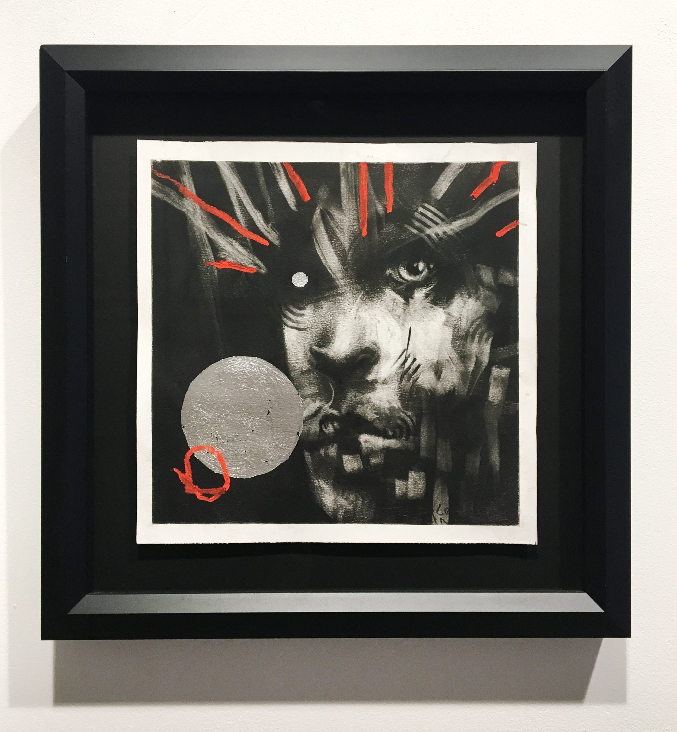 Charcoal and metallic leaf on paper. Comes framed in box frame with museum glass (minor damage to frame on top left corner)